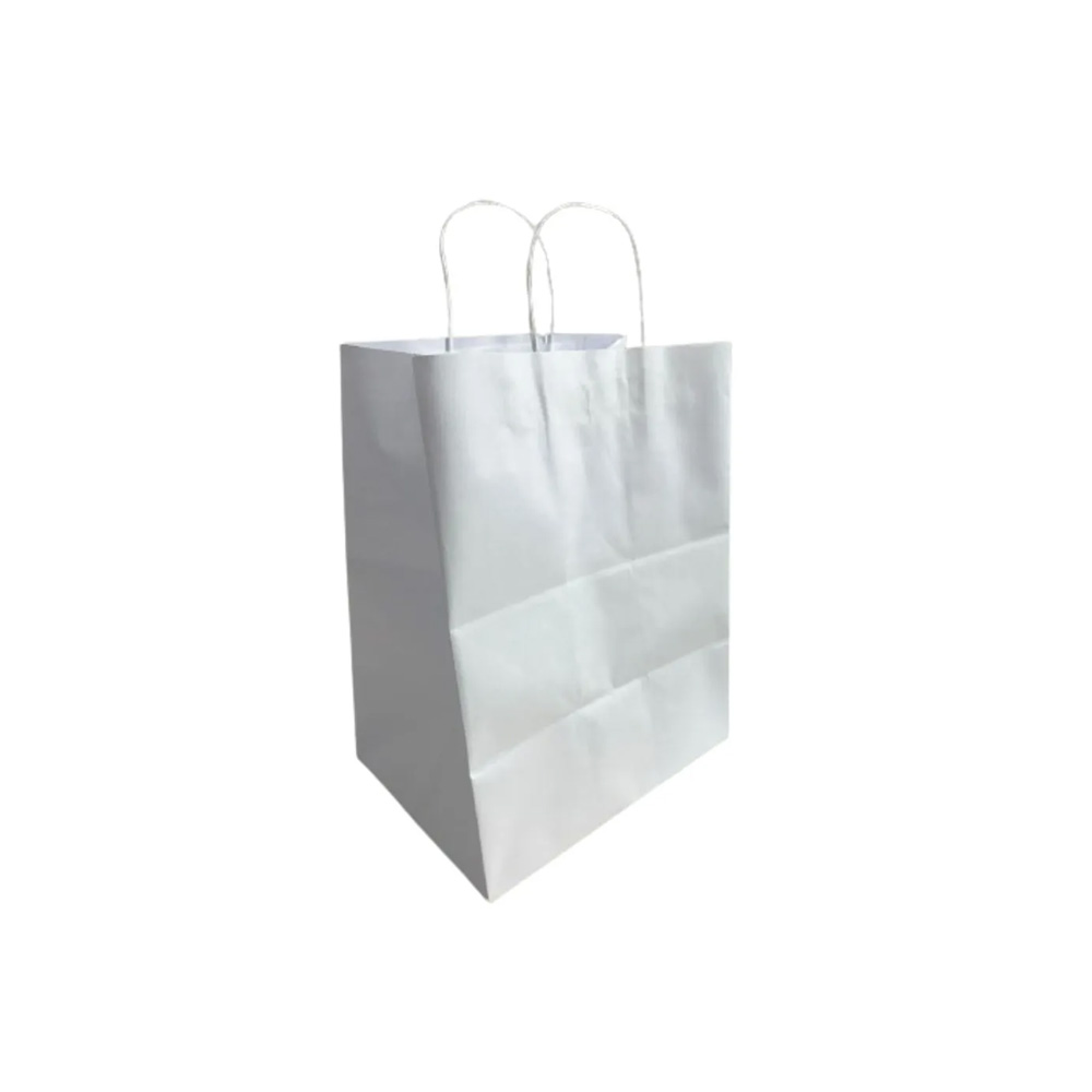 Modelo médio em papel branco resistente, excelente para embalagens de roupas, alimentos e brindes. Alças reforçadas e acabamento de alta qualidade. Dimensões: 27 × 20 × 11 cm